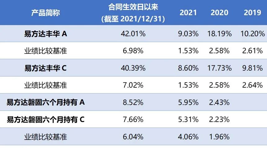 注:数据取自基金定期报告,截至2021/12/31。易方达丰华债券型基金合同生效日:2019/2/19,业绩基准:沪深300指数收益率×10%+中债总指数收益率×90%,易方达丰华债券型基金于2019/2/19由易方达保本一号混合型证券投资基金转型而来,目前由李中阳与张清华、王成联合管理,张清华自2019/2/19起开始任职,王成自2019/11/28起开始任职,李中阳自2021/7/8起开始任职;易方达磐固六个月持有期混合型基金合同生效日:2020/9/3,业绩基准:中债新综合指数(财富)收益率×90%+沪深300指数收益率×10%,历任基金经理(任职日期):张清华(2020/9/3-2021/9/18),李中阳(2021/5/19至今)。易方达丰华债券型基金、易方达磐固六个月持有混合型基金分别于2020/12/18、2020/10/14修改投资范围,增加存托凭证为投资标的,详阅法律文件。