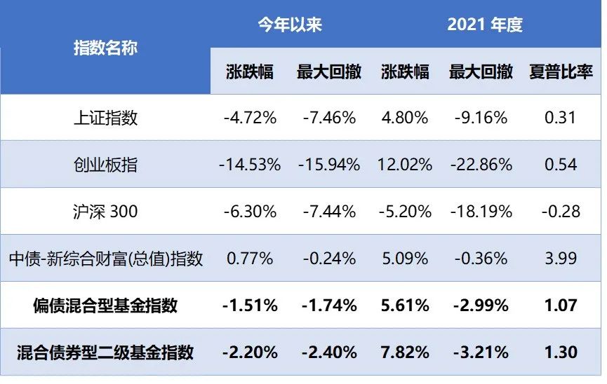 基于此市场环境,主投债券,辅以股票、打新、定增等策略的多资产配置类产品因力争“集众家之所长”,整体表现相对稳健,以偏债混合型基金指数和混合债券型二级基金指数为例,今年以来表现相对更为稳健,2021年全年夏普比率亦大于主要股票指数。