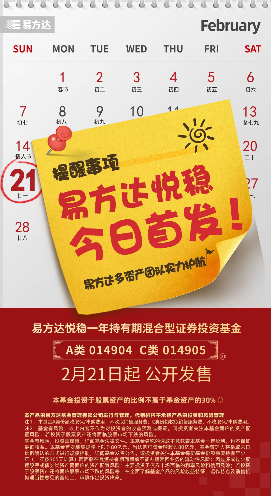 基金有风险,投资需谨慎,详阅基金法律文件。本基金名称的选取不意味着本基金一定盈利,也不保证最低收益。本基金首次募集规模上限为80亿元,当认购申请金额超过80亿元,基金管理人将采取末日比例确认的方式进行规模控制,详阅基金发售公告。请投资者关注本基金每份基金份额需要持有至少一年(一年按365天计算)而面临在最短持有期到期前不能办理赎回业务的流动性风险;因过多或过少配置股票或债券类资产而面临的资产配置风险;主要投资于债券市场面临的利率风险和信用风险;若投资于股票资产还将面临股票市场下跌的风险等,在全面了解基金产品的风险收益特征、运作特点及销售机构适当性意见的基础上,审慎作出投资决策。