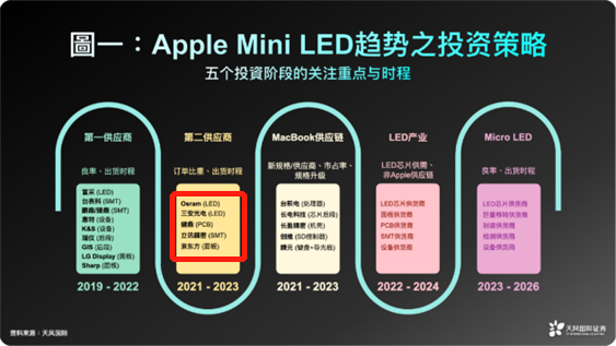 而天风证券郭明錤此前便指出,苹果Mini-LED量产计划大致分为五个阶段。其中,第二阶段,苹果公司将积极寻找Mini-LED关键零组件第二供应商,出货比重将显著成长——有望受益厂商名单中便有立讯精密。
