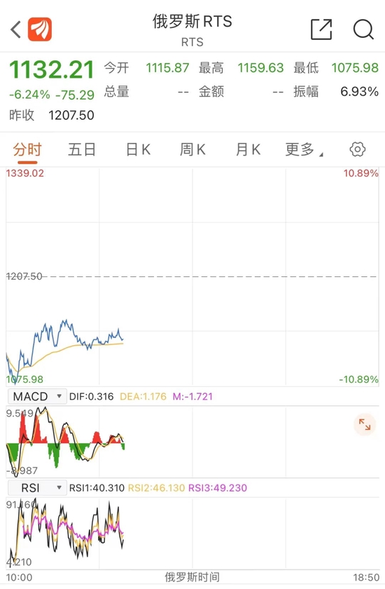 继昨日大跌超10%后,俄罗斯股市今日继续大幅下挫。俄罗斯MOEX指数一度跌超9%,俄罗斯交易系统指数(RTS)一度跌超10%。