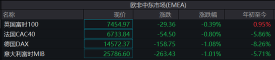 欧股开盘则集体大幅下跌,不过随后跌幅有所收窄。截至发稿,英国富时100指数跌0.39%,法国CAC40指数跌0.8%,德国DAX指数跌1.08%,意大利富时MIB跌1.01%。