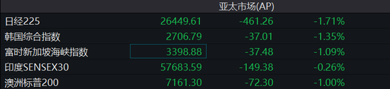 此外,日经225指数下跌1.71%,韩国综合指数下跌1.35%,富时新加坡海峡指数下跌1.09%。