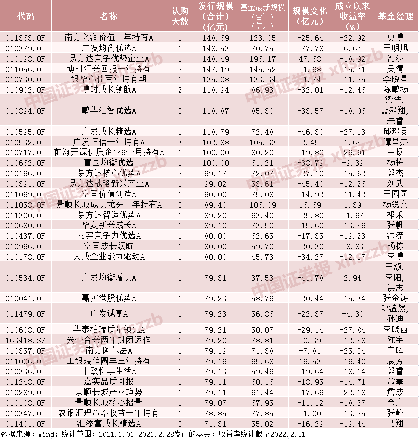 2021年前两个月,爆款基金频出。Wind数据显示,认购时间不超过3天,且发行规模超70亿元的基金共有33只,其中达到百亿规模的共有11只。