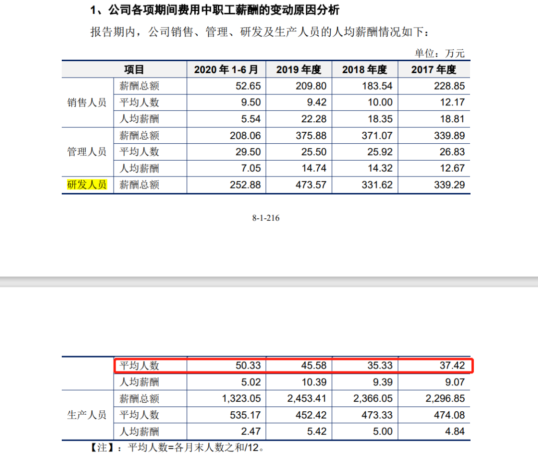 但在快可电子早前申请科创板上市时的一份问询函中,同样源于一份职工薪酬的变化表显示,在2020年1-6月间,其销售人员、管理人员、研发人员及生产人员的平均人数总和便已经达到了624.5人。