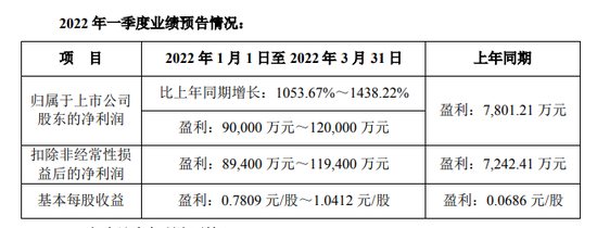 2月21日晚间,雅化集团发布了2022年一季度业绩预告称,预计报告期内实现归属于上市公司股东的净利润9亿元-12亿元,同比增长1053.67%-1438.22%。