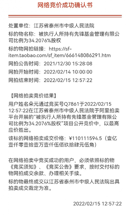 值得注意的是,前不久先锋基金34.21%的股权还在阿里拍卖平台上被拍卖。就在今年2月15日,阿里拍卖平台的拍卖信息显示,在江苏省泰州市中级人民法院于阿里拍卖平台开展的“被执行人所持有先锋基金管理有限公司比例为34.2076%股权”项目公开竞价中,朵元以最高应价胜出,竞得先锋基金约34.21%的股权,成为先锋基金的第一大股东。该标的网络拍卖成交价格为1.1亿元。