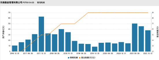 Wind数据显示,先锋基金在成立之初资产规模增速明显,一年的时间从10.71亿元扩张到2017年底的63.02亿元。但后来公司规模大幅下跌,到2019年年末一度管理规模仅剩8.74亿元。截至2021年四季度末,先锋基金的管理规模为38.18亿元。