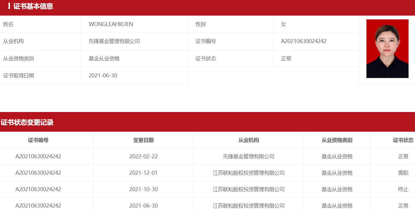 虽然网上无法查询到关于Wong Leah Kuen的公开报道,但澎湃新闻记者翻查中国基金业协会官网资料发现,Wong Leah Kuen是一位女性。这也就意味着,在以男性“掌舵人”居多的公募基金行业,又添了一员女将。