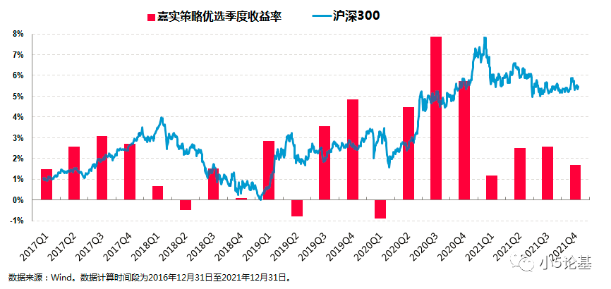 前面所有的仓位调整最终都落实成了基金的季度收益:从2017年一季度至今,嘉实策略优选的总共20个完整季度的收益率有17个为正,而负的三个季度收益也都在控制在-1%以内。