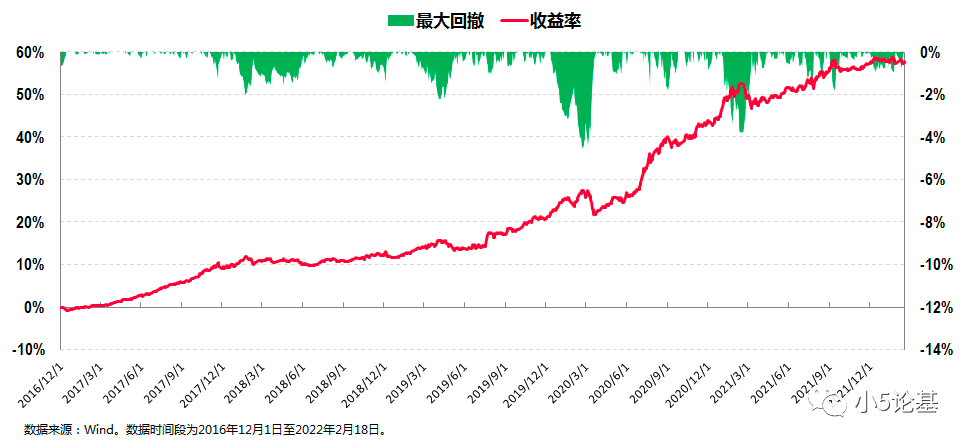 从收益率的角度来看,这只基金在胡永青管理期间(2016/12/1~2022/2/18,下同)的总收益率为57.83%,折合年化收益率为9.14%。从风险控制的角度来看,这只基金在胡永青管理期间的最大回撤为-4.49%,这个最大回撤发生于疫情突袭的2020年一季度。