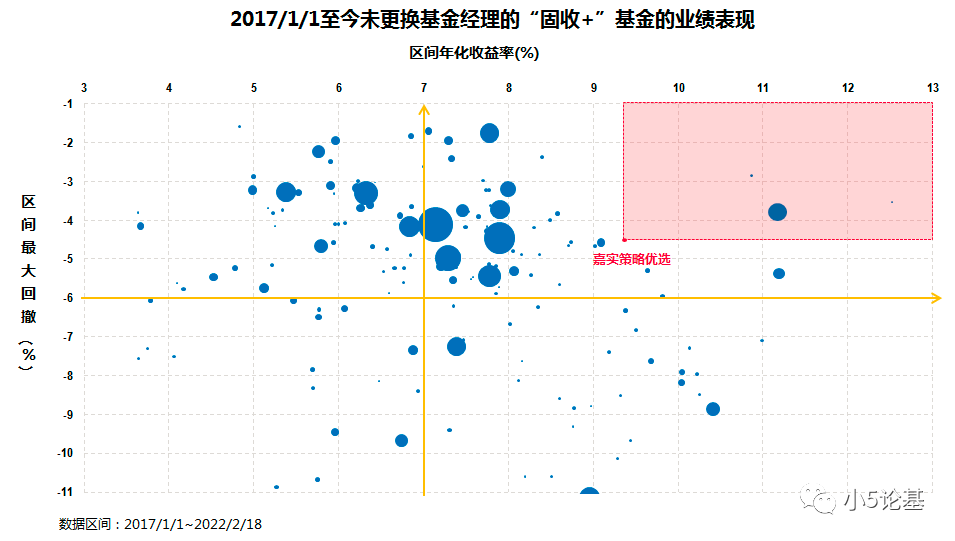 上图的数据区间为2017年1月1日至2022年2月18日,我简单把市场上股票占比介于5%到30%之间的基金都归类为“固收+”类产品,除了二级债基之外,还可能包含一级债基,混合偏债基等,纵坐标取了区间最大回撤作为风险指标。