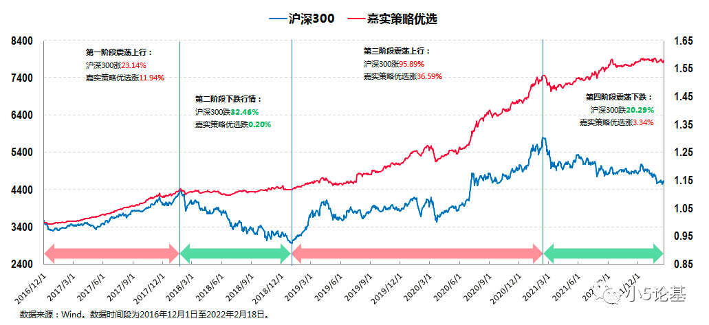 比如几乎全线下跌的第二阶段,在最抗跌的沪深300指数都跌了32.46%的情况下,组合仅仅微跌-0.20%。而在2021年2月至今的最近这轮调整中,沪深300早已华丽丽地跌去20%+,而同期的嘉实策略不仅没跌甚至还逆势小涨了3.34%,即便是在最艰难的2022年以来(截至2022年2月18日),组合也仅跌去-0.43%。