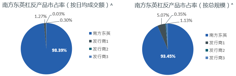 截至2021年12月31日,南方东英的杠杆及反向产品市占率按成交额达到98%,按规模达到94%[1]。与此同时,南方东英也积极在杠杆及反向产品领域不断探索新的产品形式。