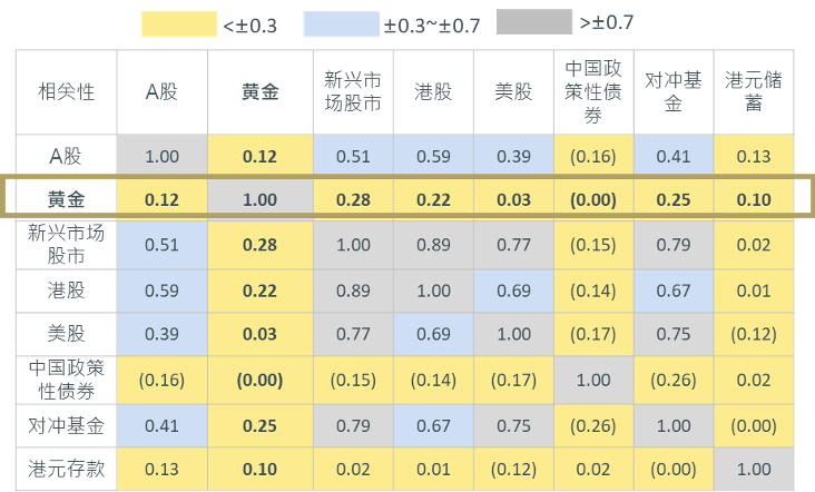 黄金与其他资产的相关性较低,因此可以为投资组合提供更好的下行保护。在资产组合中添加黄金资产,往往可以在降低组合风险的同时、提高收益率。
