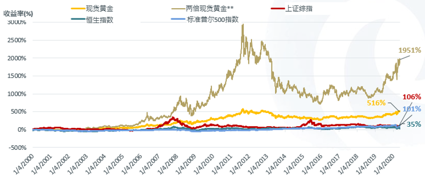 过去20年黄金价格上涨了4倍,远超中国和美国股市的表现。从1999年12月31日到2020年5月22日,现货黄金的累计收益率为516%,而标准普尔500指数上涨了101%,恒生指数上涨了35%,上证综指上涨了106%。两倍杠杆现货黄金的累计收益率将高达1951%。