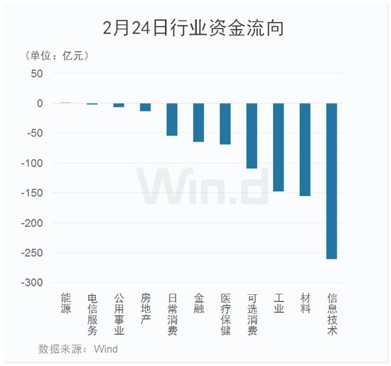 从2月24日行业资金流向来看,主力资金净流出800多亿元,多数行业净流出,其中信息技术板块净流入额超过250亿元,位居首位;材料、工业、可选消费等板块净流出额亦较高;仅能源板块微幅净流入。