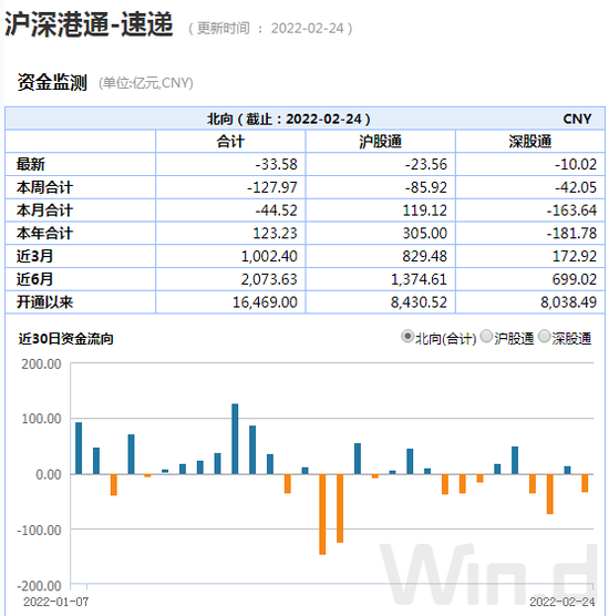 2月24日,北上资金净卖出33.58亿元,本周累计净卖出127.97亿元,本月净卖出44.52亿元。受海外局势不稳定因素影响,资金流出避险,近期整体呈现流出态势。