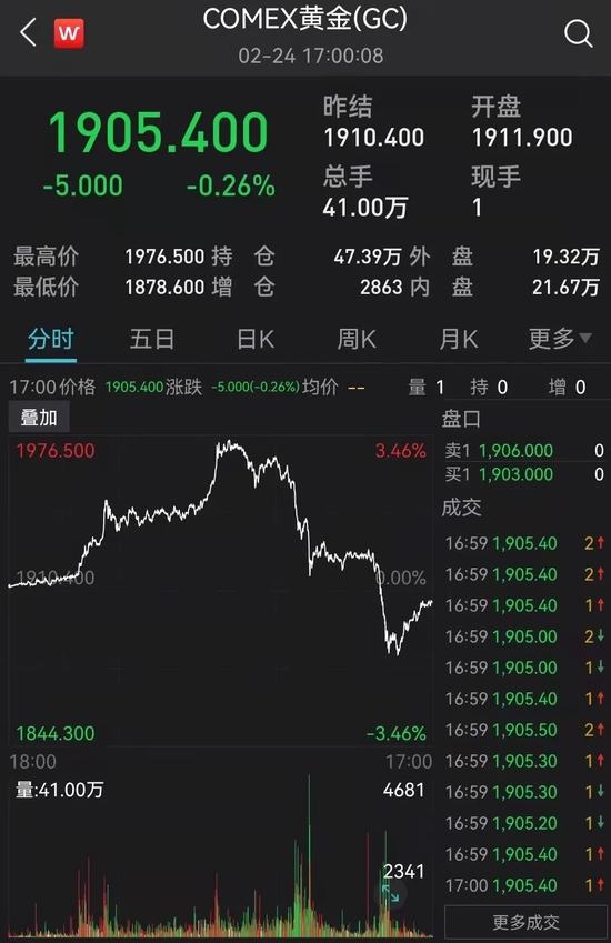 COMEX黄金期货收跌0.26%报1905.4美元/盎司,COMEX白银期货收跌1.25%报24.245美元/盎司。随着美股攀升,黄金期货从高位回落逾70元,盘中最高触及近两年高位1976.5美元。