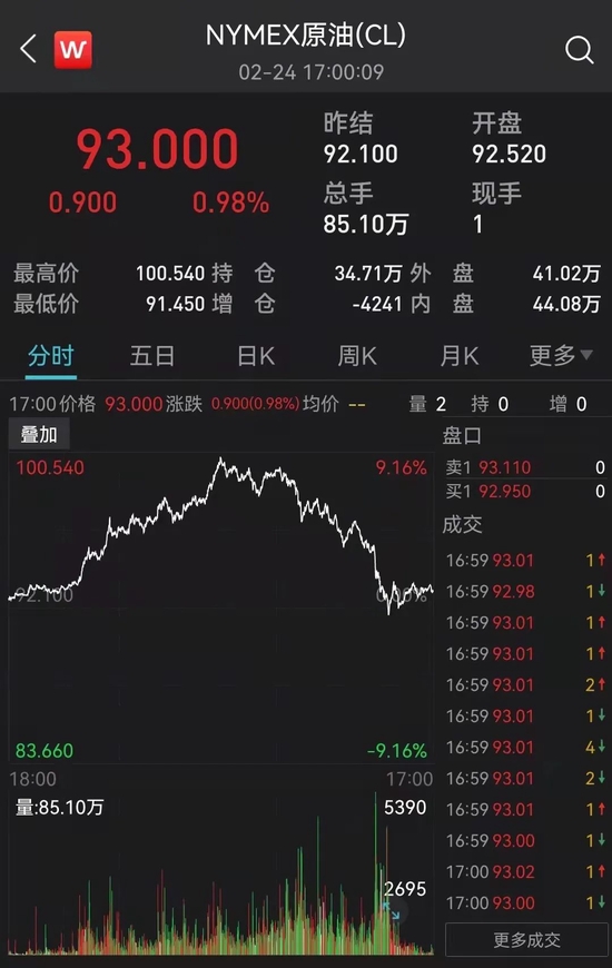 油价回吐大部分涨幅,之前美国总统拜登表示正在与主要消费国合作,将联手从战略石油储备中释放原油。美国的最新制裁并不包括限制俄罗斯原油供应。纽约原油期货收盘报93美元/桶,布伦特原油也降至100美元下方。