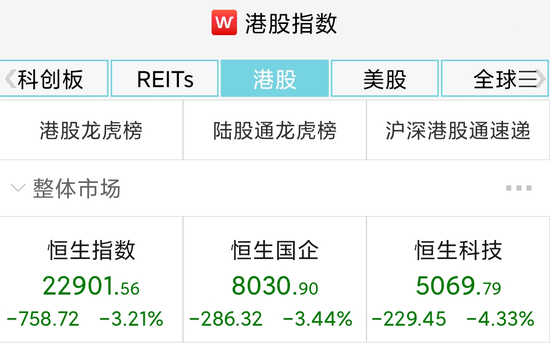 恒生指数收跌3.21%报22901.56点;恒生国企指数跌3.44%报8030.9点;恒生科技指数跌4.33%报5069.79点,再创新低。
