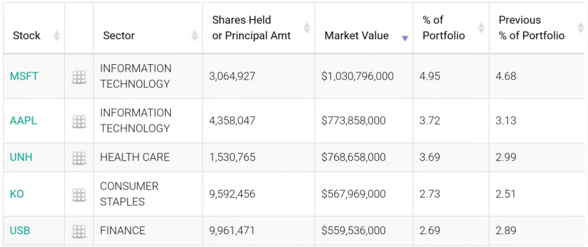 数据显示,该基金去年四季度末持仓总市值约208.2亿美元,前十大持仓标的占比30.46%。其中第一大重仓股为微软,占比4.95%,苹果、联合健康、可口可乐、美国合众银行分列第二至第五大重仓股。