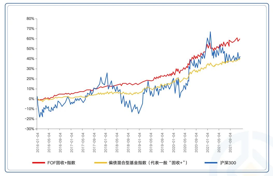 数据来源:wind,时间截至2021-12-31。上图仅反映特定指数的历史表现情况,不代表基金未来业绩表现。但最近,富二发现固收+的“潜能”不止于此。比起“原装”的纯固收+,如果给它再赋予一层神秘BUFF,将会收获一个战斗力更强的品种——“固收+FOF”!这条彪悍的FOF固收+指数曲线将普通固收+曲线全面压制,有图有真相——