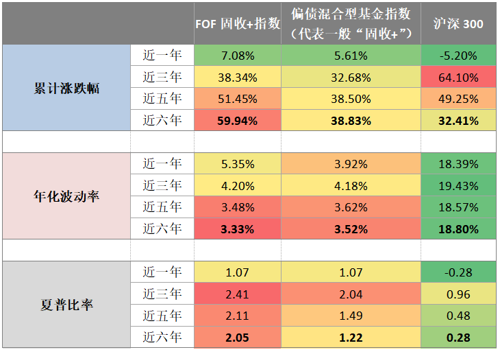 wind数据显示,FOF固收+指数,近六年累计涨幅为59.94%、年化波动率3.33%、夏普比率2.05;相比一般“固收+”(偏债混合型基金指数)、沪深300,收益更高、波动率更小,这“性价比”可太诱人了!