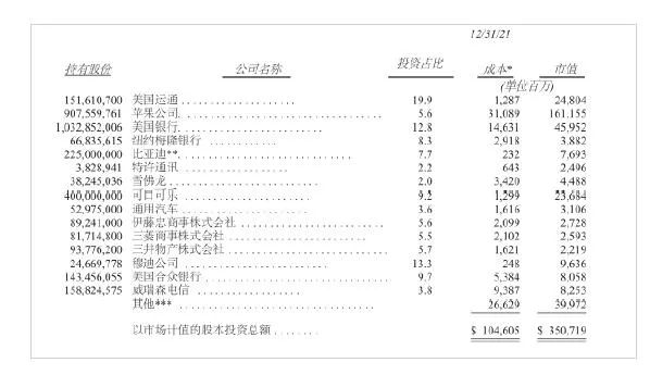 目前,伯克希尔的重仓板块分别为保险、科技(苹果)、铁路(BNSF)、电力及再生能源(BHE),公司2008年9月买入的比亚迪持有13年盈利32倍(通过旗下能源公司持有),至今一股未卖;同时手握1440亿美元现金,相当于构建了一个70%股票+30%现金的混合型基金组合,还有保险板块可以不断提供现金流,这是长期投资的坚实基础。