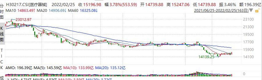 数据来源:同花顺 iFinD 取数时间:2022年2月24日经过前期的快速下跌后,近期医疗器械指数也出现企稳迹象。2022年2月14日至25日期间,指数出现连续两周的盘底整理,并两次出现大涨。2月25日单日大涨3.78%,显示其投资价值得到越来越多投资者的关注。