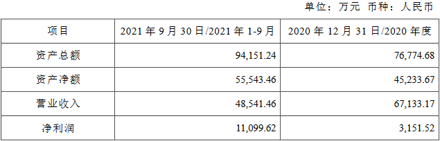 2020年和2021年1-9月,标的公司实现营业收入分别为6.71亿元和4.85亿元,实现净利润分别为3151.52万元和1.11亿元。截至2020年12月31日、2021年9月30日,标的公司资产总额分别为7.68亿元、9.42亿元,资产净额分别为4.52亿元、5.55亿元。