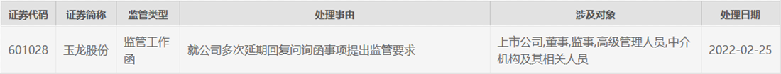 中国经济网北京2月28日讯上交所于2月25日下发对玉龙股份(601028.SH)的监管工作函,就公司多次延期回复问询函事项提出监管要求,涉及对象为上市公司、董事、监事、高级管理人员、中介机构及其相关人员。