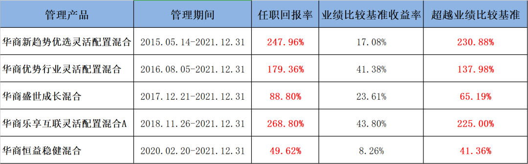 2020年全年,沪深300指数上涨27.21%,他管理的华商新趋势优选灵活配置混合斩获了77.42%的回报率,再次在成长行情中凯旋而归;在投资难度陡然提升的2021年,全年沪深300指数下跌5.20%的情况下,该基金依旧取得了22.85%的回报率。