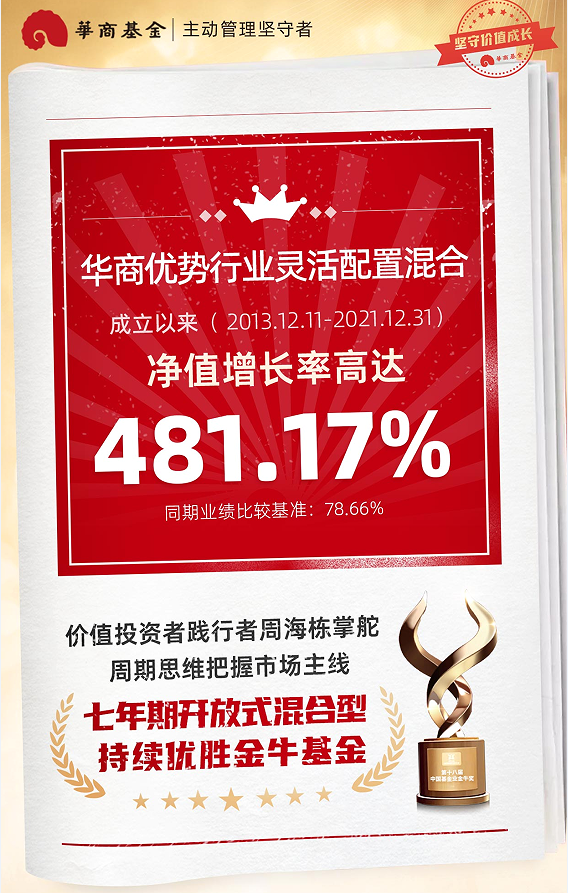 华商优势行业灵活配置混合成立于20131211,于20201228修改投资范围,增加存托凭证为投资标的,详阅法律文件。业绩比较基准为:沪深300指数收益率*55%+上证国债指数收益率*45%;本基金2017-2021年各年度净值增长率分别为12.13%、-17.08%、64.28%、56.88%、15.57%;本基金同期业绩比较基准增长率分别为11.92%、-12.22%、21.32%、16.76%、-0.66%;业绩登载期间基金经理变更情况:周海栋(20160805至今)。周海栋任职回报率及同期业绩比较基准为(20160805-20211231):179.36%、41.38%。