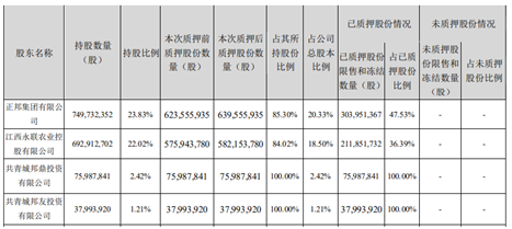 然而,频繁掏家底的情况下,控股股东正邦集团及其一致行动人的资金链也紧绷了起来。眼下,正邦集团、江西永联所持股份的质押比例,分别为85%、84%,其他3家一致行动人中,有两家的质押比例都为100%。