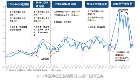 猪周期一般3-4年为一轮,目前猪周期下行已经接近一年时间,不论市场投研分析还是猪肉行情,已经呈现底部企稳的态势,甚至有多家券商研报分析称,2022年6-8月时,猪周期将见底。