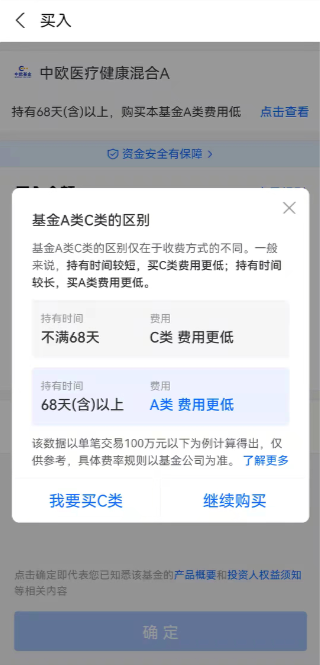 界面新闻记者尝试购买葛兰的中欧医疗健康A,进入购买界面后,页面显示,以持有时间68天为界限,A类、C类份额的费用会有差别,为投资者在作出购买选择时提供了参考。