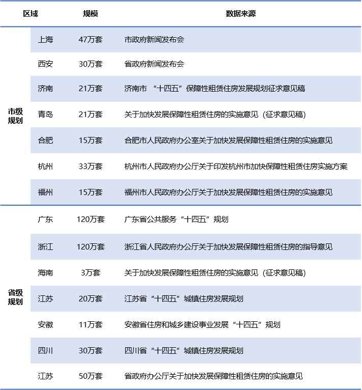 上述政策以及与之配套的各地“十四五”期间相关规划,对各地租赁住房供应规模进行了明确,在比例上多地规定保障性租赁住房占新增住房供应套数的比例至少达到15%以上。据不完全统计,部分省市的保障性租赁住房在“十四五”期间的规划规模如下。