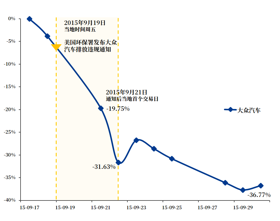 参考资料:Volkswagen Emissions Scandal Wikipedia,数据来源:WIND,数据区间2015/09/17-2015/09/30,以2015年9月17日股价为原点计算相对跌幅;注:以上内容仅为历史事件回顾,不代表公司立场,本文提及大众汽车为德国法兰克福证券交易所上市公司,与A股港股主体无关。