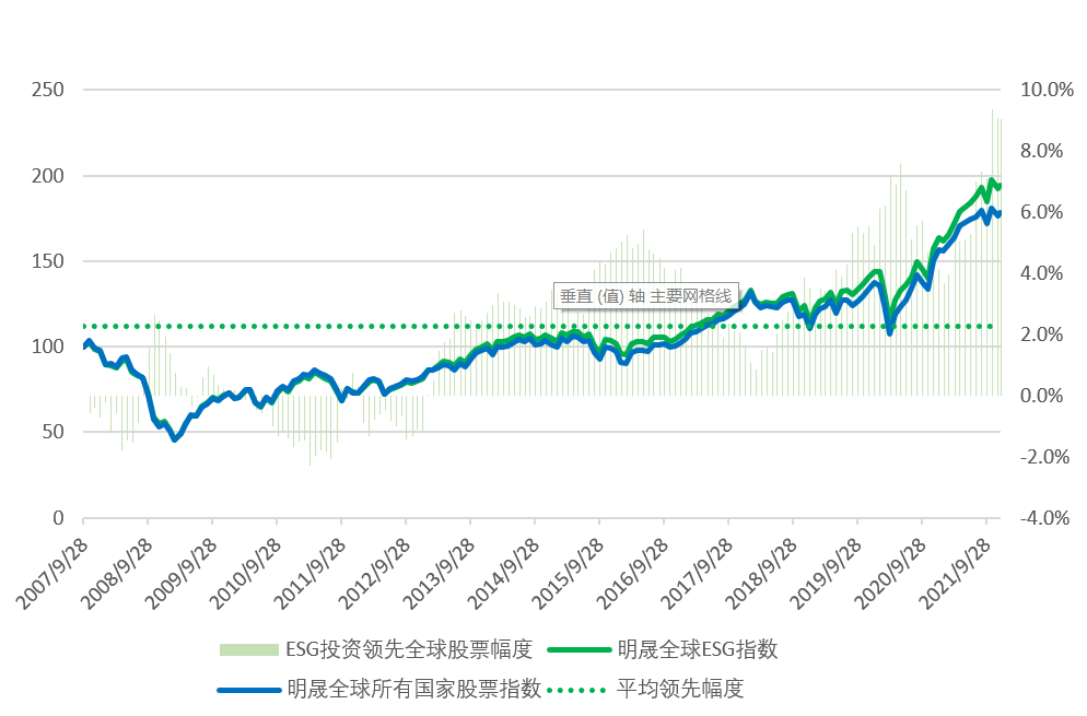 截至2021年底,在MSCI全球ESG指数在170个完整月份中,有128个月度跑赢了MSCI世界所有国家股票指数,概率超过75%。