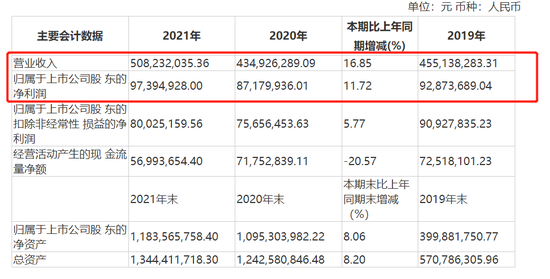 据松井股份披露的2021年年报显示,公司全年实现营收5.08亿元,同比增长16.85%;实现净利润9739.49万元,同比增长11.72%。(见下图)