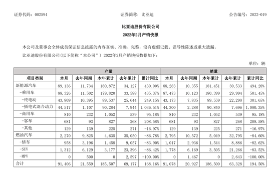 3月3日,比亚迪披露了2月产销快报。公告显示,今年2月,比亚迪合计销量9.1万辆,环比下滑0.05%。1-2月,比亚迪累计销量18.65万辆,同比增长194.50%。