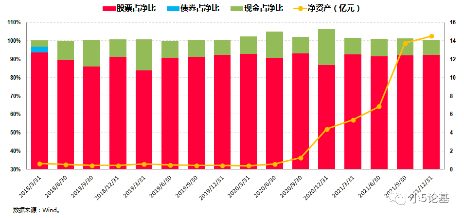 而在实际的投资中,组合长期平均保持在9成以上的高仓位运作,最新的2021年四季报显示其股票占净值比为92.37%。