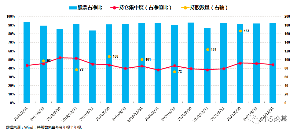 最新的2021年四季报显示其持股集中度为44.63%,占其全部股票仓位的五成左右,与长期平均持仓集中度基本持平;而2021年中报显示其持股数量增加到167只,与之前的持股数量相比有较为明显的增加。