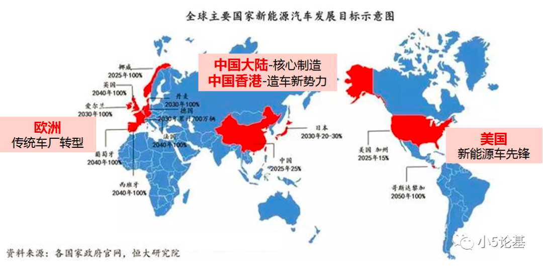 从新能源车整个产业链版图来看,优势环节分布在不同的交易市场。中国内地的是资源和制造;中国香港的是造车新势力;北美的是智能化和整车引领者;欧洲和日韩的是则转型中的传统燃油车企。