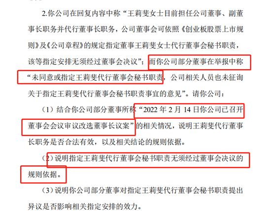 大家对于王莉斐代行董秘这个岗位就产生了异议,也基本上就是以上不保证公告真实性的董事们并不同意让王莉斐女士代行董秘职务,深交所也就此发函问公司,代行董秘不需要经过董事会决议的规则和依据。
