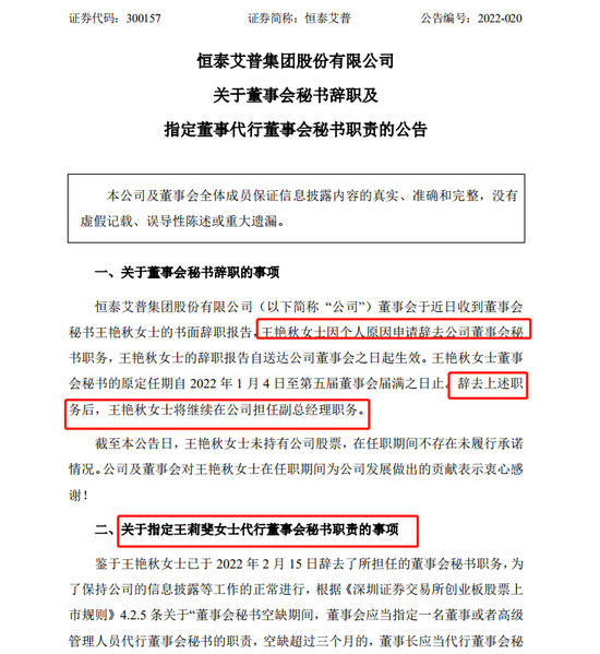 全票通过,说明当时董事会在聘任这位董秘时还是没有分歧的,只是王艳秋女士上任才1个多月,就让出了董秘这个位置,但是继续担任公司副总经理,公司公告董事会指定王莉斐女士代行董事会秘书职责,后者为公司副董事长,并代行董事长职位(董事长也几乎是同一时间辞职,就是目前担任公司总经理的孙玉芹)。