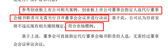 但是从合规角度上看,公司的这个回复肯定是有问题的,董事会指定人选代行董事会秘书,这个董事会是公司所有董事组成的董事会,如果12位董事成员,只有5位董事成员同意代行,其他7位不同意,又何来董事会指定呢?从其他创业板公司案例也可以看到,同样是创业板公司,在指定高管代行董秘时,是进行了董事会决议的,当然,在全体董事口头同意的情况下,也可以豁免不用专门一起来开会决议。