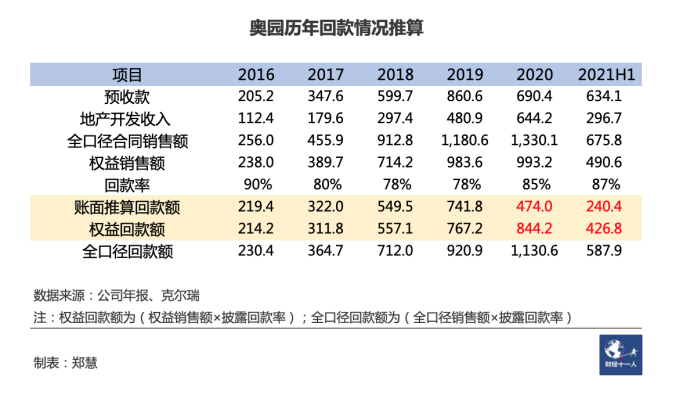 从下表可以看出,2020年与2021上半年,综合奥园权益销售额与回款率,得出的回款金额,与报表数值推算的结果差异较大。