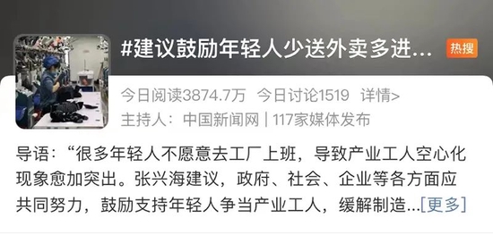 这个周末,一条两会代表的建议冲上了微博热搜并引发热议,全国人大代表、小康集团创始人张兴海在他提交的《关于政策支持鼓励制造业吸纳更多员工就业的建议》中直言,“要鼓励年轻人少送外卖多进工厂”。